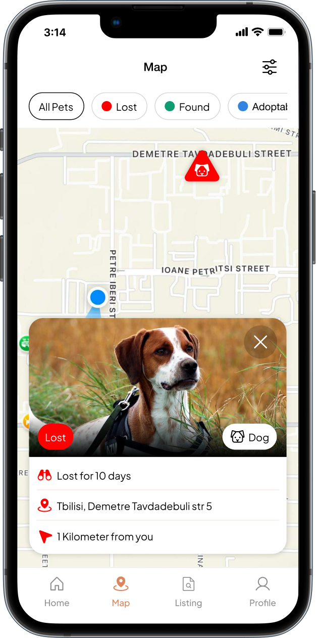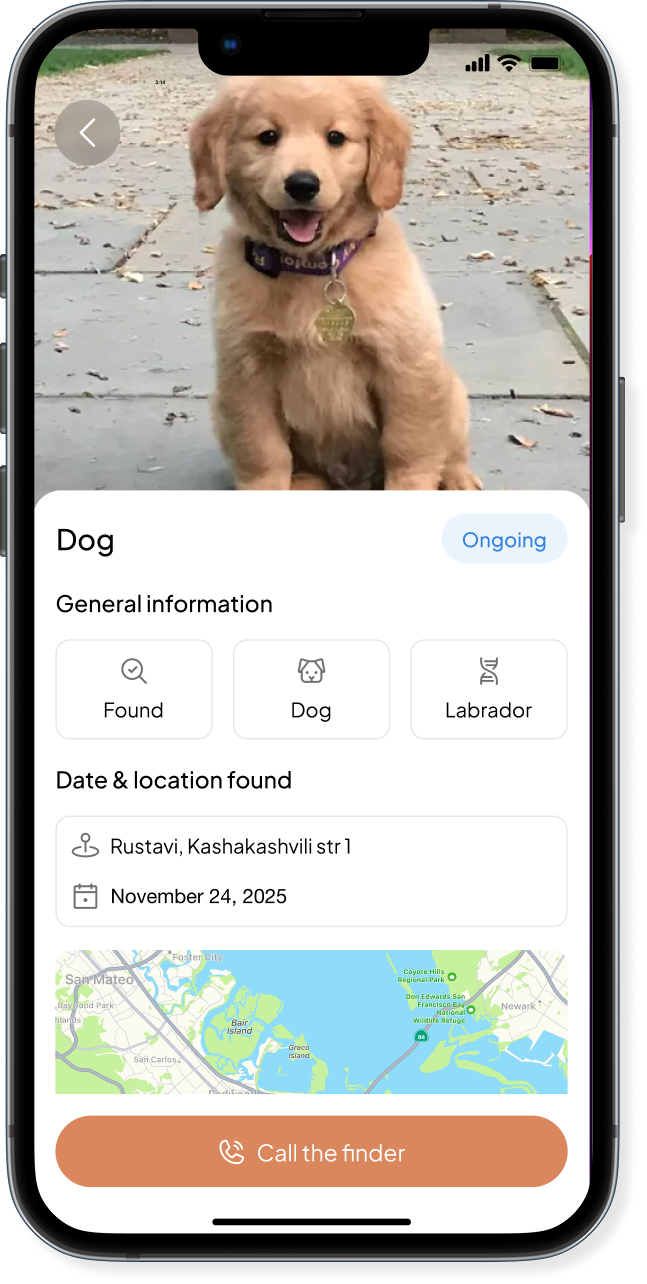 The map is one of the main features. It lets you see lost, found, or pets available for adoption around you or in any area where people use the app. When you tap on a marker, you can view the full post with all details.